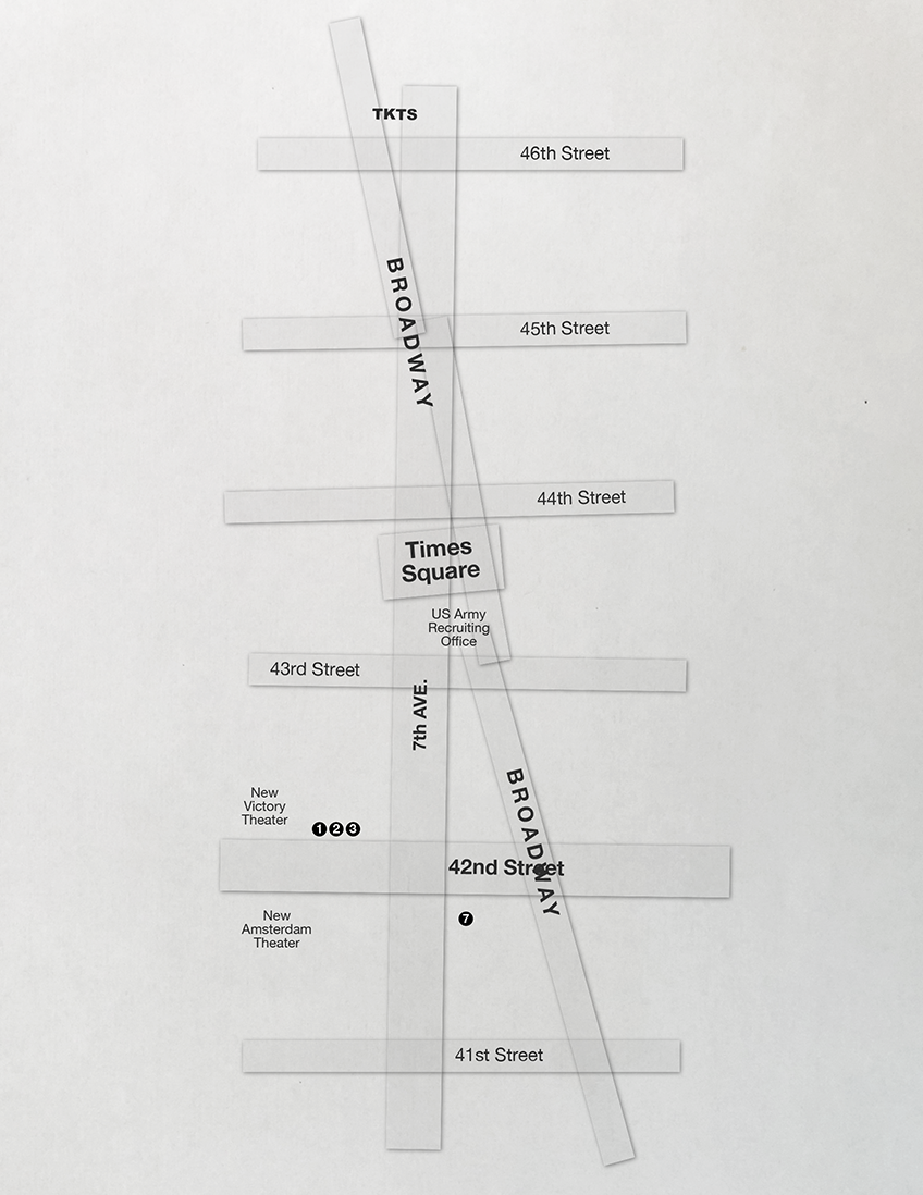 In my first job out of college, I used to create maps and diagrams and label them via a machine that would spit out text on tape you could transfer to paper. You could put labels on top of labels and not have the layers of tape show up when it was reproduced. If you made a mistake, you could sometimes remove and reposition the tape. But sometimes you would pull some of the text up and leave some behind. The result was, like Times Square, a pastiche of competing layers.